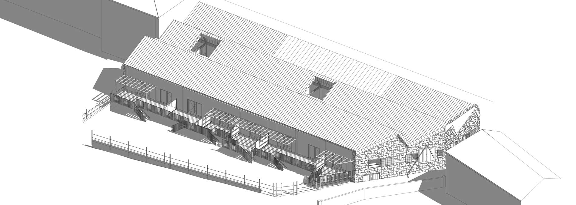 Les logements bénéficient de la lumière des sheds et de l’ouverture sur une terrasse privative coté jardin, le long du Rhins.