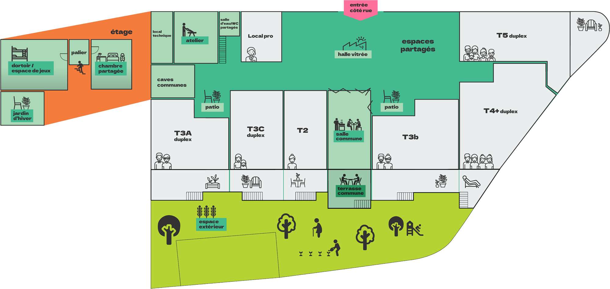 La rencontre des habitants est favorisée par une diversité d’espaces communs qu’ils seront invités à partager en fonction de leurs besoins.