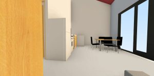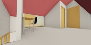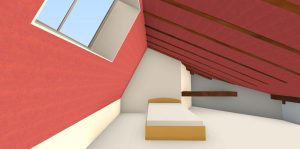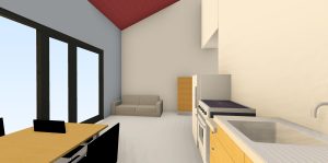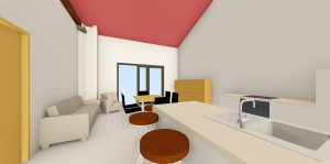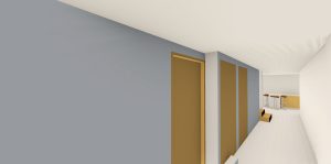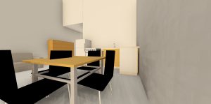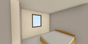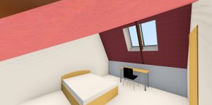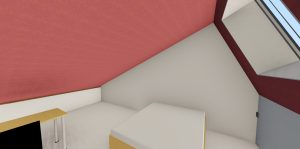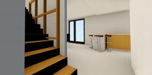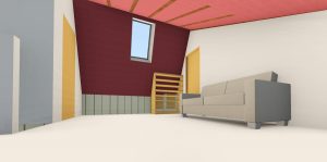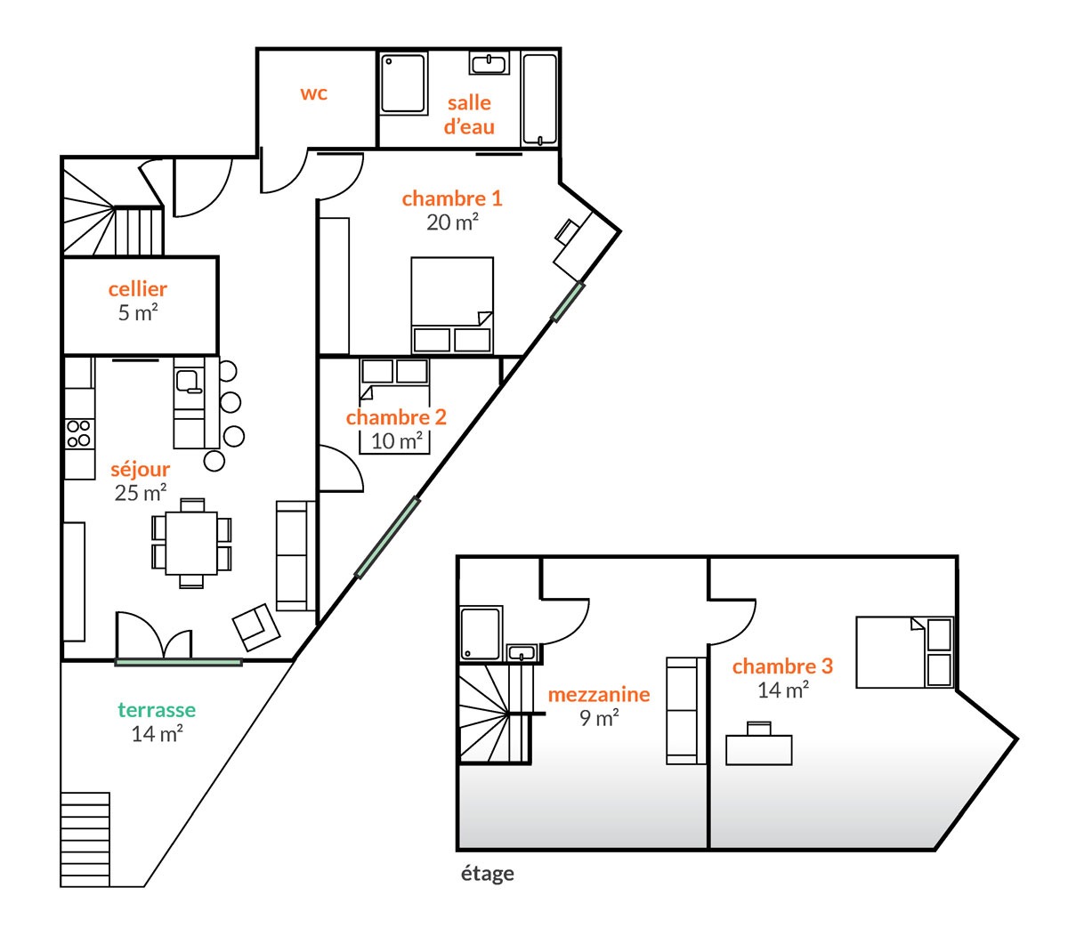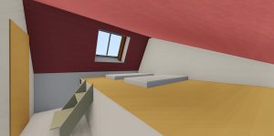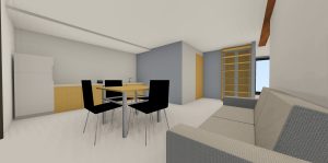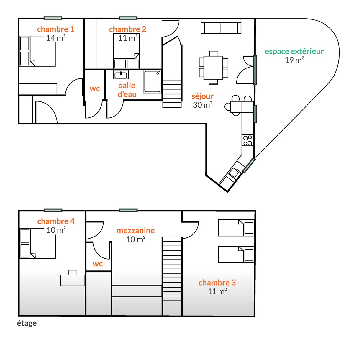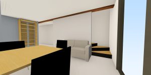 C’est un appartement familial avec une forme atypique, il possède 3 chambres dont 2 en rez-de-chaussée et une mezzanine à l’étage amenant à la troisième chambre sous les toits.