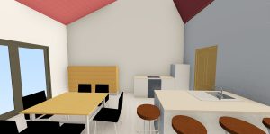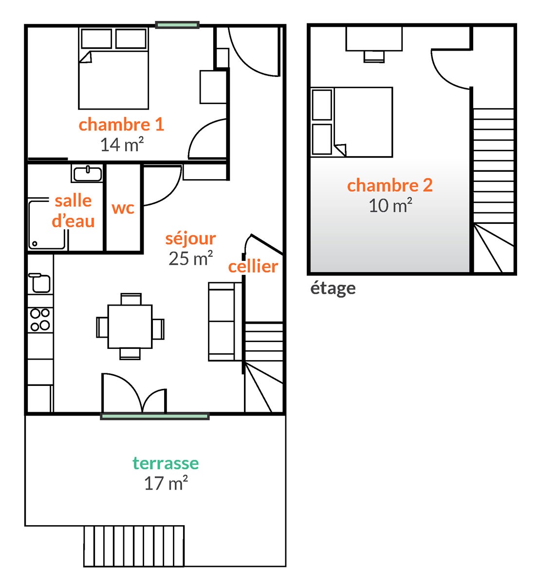 Il est fonctionnel et confortable pour deux ou trois personnes grâce à ses 2 chambres. La première chambre est au rez-de-chaussée, à côté d’une salle d’eau et d’un WC séparé et peut s’adapter à des personnes à mobilité réduite. La seconde chambre (ou bureau) est à l’étage sous les toits.