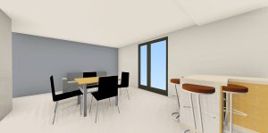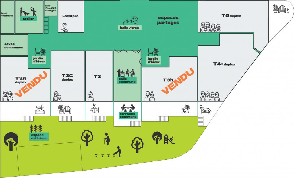 Ces espaces privés bénéficient de 400m² d’espaces partagés qui permettront aux habitants d’augmenter leur espace de vie. Les terrasses privatives donnent accès à un jardin de 375m² le long du Rhins.
