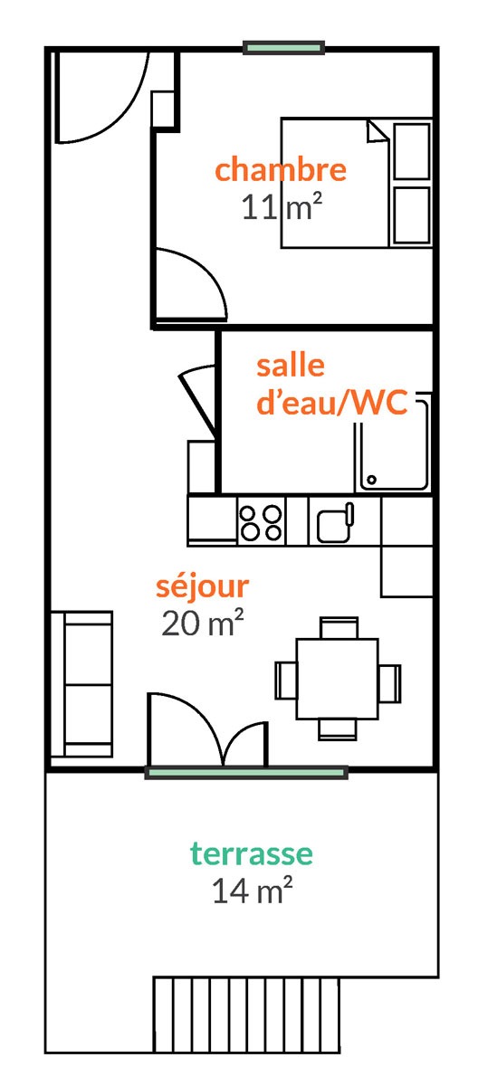 Il est fonctionnel et confortable pour une personne seule ou en couple et adapté à des personnes à mobilité réduite.
