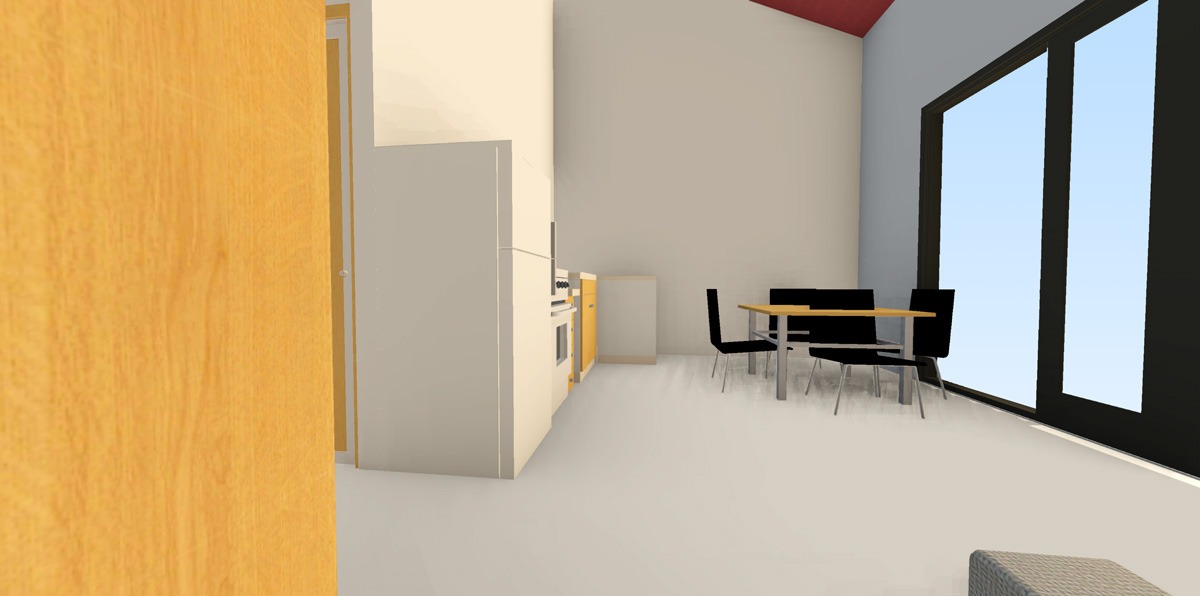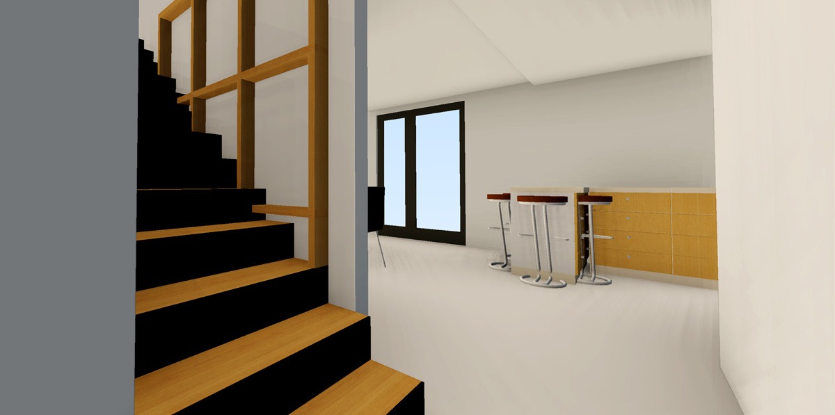 C’est un appartement familial avec une forme atypique, il possède 3 chambres dont 2 en rez-de-chaussée et une mezzanine à l’étage amenant à la troisième chambre sous les toits.